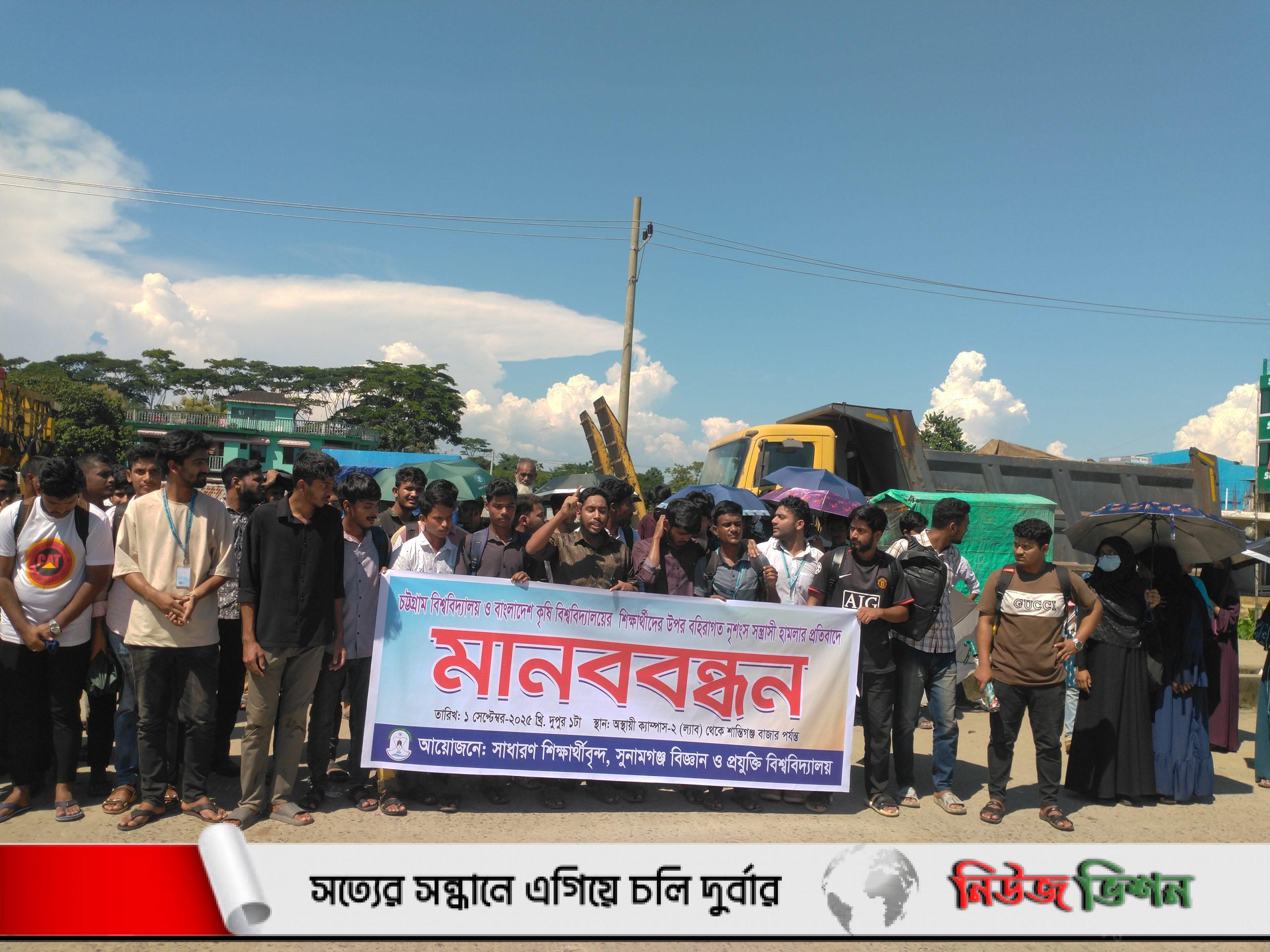শিক্ষার্থীদের উপর নৃশংস সন্ত্রাসী হামলার প্রতিবাদে সুনামগঞ্জ বিজ্ঞান ও প্রযুক্তি বিশ্ববিদ্যালয়ের শিক্ষার্থীদের মানববন্ধন