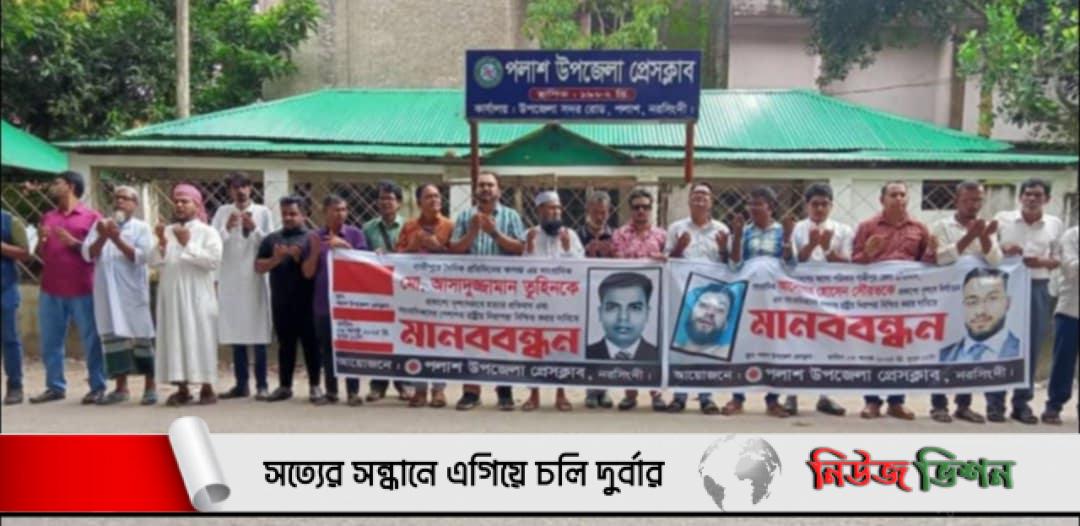 শনিবার (৯ আগস্ট) সকালে পলাশ উপজেলা প্রেস ক্লাবের সামনে এই মানববন্ধন অনুষ্ঠিত হয়।