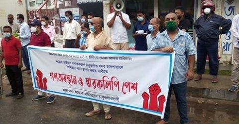 ঘণ্টা ব্যপী কর্মসূচীতে বক্তারা বলেন, ঠাকুরগাঁওয়ে গতকাল পর্যন্ত মোট করোনা রোগীর সংখ্যা ১৬৯ জন। কিন্তু করোনা টেস্টের নমুনা সংগ্রহ ও প্রেরিত নমুনার ফলাফল তেমন পাওয়া যাচ্ছেনা বলে আমরা ঠাকুরগাঁওবাসী শঙ্কিত ও ভীতীকর পরিস্থিতিতে জীবন যাপন করছি। আমাদের ঠাকুরগাঁওয়ে পিসিআর ল্যাব না থাকার কারনে আমাদের পর্যাপ্ত টেস্ট হচ্ছেনা। অন্য জেলাতে আমাদের রক্ত ও লালার নমুনা পাঠাতে হচ্ছে। ফলাফল হাতে পেতে সময় লাগছে কমপক্ষে ৫ থেকে ৮ দিন। এতে করোনা সংক্রমন বিস্তার লাভ করছে আশঙ্কা জনক হারে। সম্প্রতি ঠাকুরগাঁওয়ে করোনায় আক্রান্ত হয়ে এ এজেলার দুজন মানুষ মারা গেছেন। একটি আইসিইউ না থাকার কারনে আমরা এ দুজন মানুষকে হারিয়েছি বলে মনে বার বার কড়া নারছে আমাদের। আমরা ঠাকুরগাঁও সিভিল সার্জনের সাথে কথা বলেছি। তিনি আমাদের বলেছেন, প্রতিদিন গড়ে ২৫-৩০ টি নমুনা টেস্টর জন্য দিনাজপুরে পাঠানো হচ্ছে। যা এ সময়ের তুলনায় খুবই নগন্য। সংক্রমনের তুলনায় এত কম সংখ্যক টেস্ট দিয়ে করোনা প্রতিরোধ এ জেলায় কখনো সম্ভব নয়। ধারনা করা হচ্ছে করোনা শনাক্তের জন্য প্রতিদিন গড়ে যতগুলো টেস্ট করা হচ্ছে তার চেয়ে ১০ গুন বেশি করোনা সংক্রমন হচ্ছে প্রতিদিন। এছাড়াও দিনাজপুর আব্দর রহিম মেক্যিাল কলেজে দিনাজপুর সহ চার জেলার করোনা টেস্ট করা হচ্ছে। অথচ তাদের সক্ষমতা মাত্র ১৮৮ টি টেস্ট। কিন্ত জেলা গুলো থেকে কয়েকশ নমুনা প্রতিদিন যাচ্ছে। শুধু মাত্র কম টেস্ট হওয়ার কারনে ঠাকুরগাঁওয়ে করোনা সংক্রমন বৃদ্ধি পাচ্ছে। তাই এই বৃদ্ধি রোধে খুব দ্রুত ঠাকুরগাঁওয়ে একটি পিসিআর ল্যাব ও করোনায় মৃত্যু ঝুঁকি কমাতে একটি আইসিইউ স্থাপনের দাবি আসে আজকের কর্মসূচী থেকে।