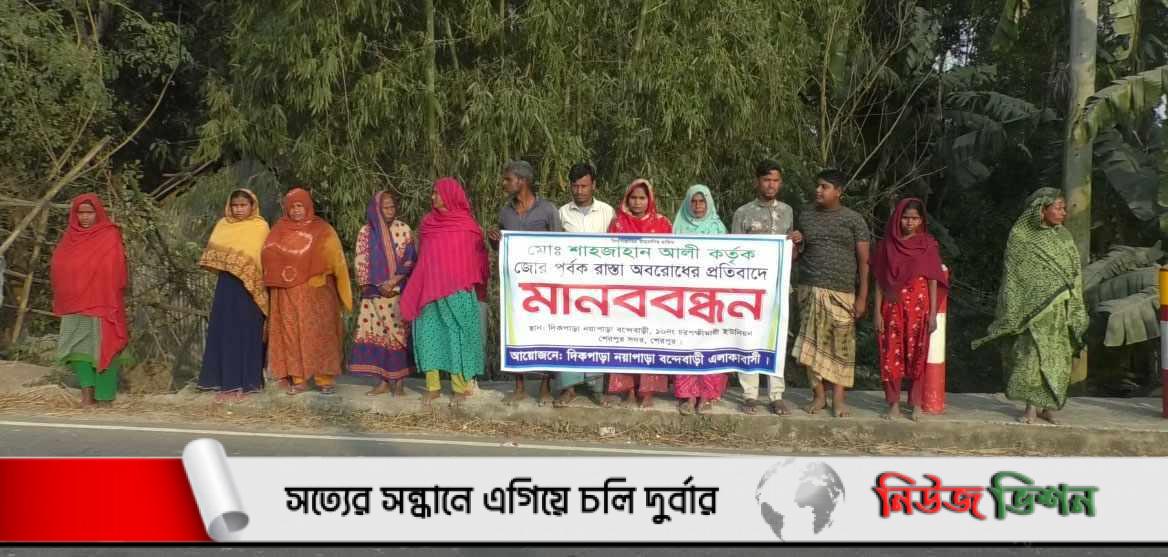 আজ ৮ ফেব্রুয়ারী বিকেলে তাদের চলাচলের একমাত্র রাস্তা বন্ধ করে দেয়ার প্রতিবাদে মানববন্ধন করেছেন অবরুদ্ধ এলাকার লোকজন। বৃহস্পতিবার বিকেল ৪টার দিকে শেরপুর সদর উপজেলার চরপক্ষিমারী ইউনিয়নের দিকপাড়ায় শেরপুর টু জামালপুর মহা-সড়কে এ মানববন্ধন কর্মসূচি অনুষ্ঠিত হয়। এসময় এলাকার লোকজন তাদের দূর্ভোগের বর্ণনা দেন ।