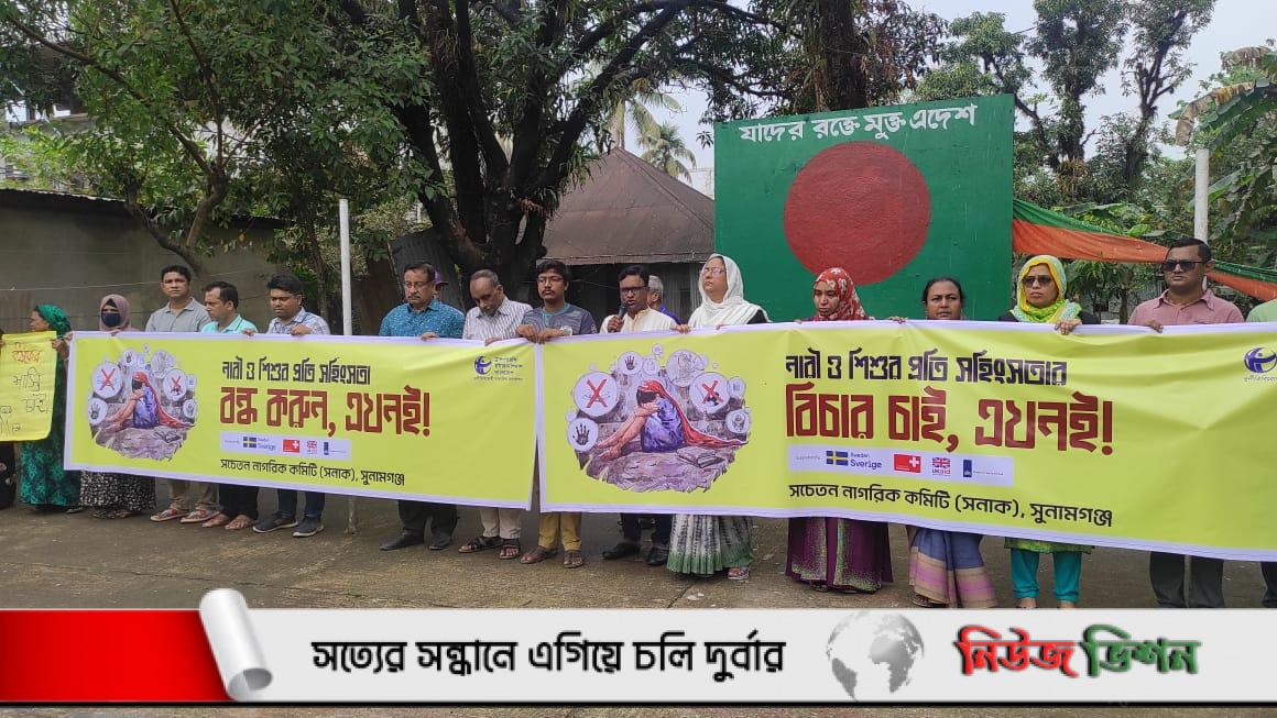 নারী ও শিশুর প্রতি সহিংসতা বন্ধে ও ধর্ষণের প্রতিটি ঘটনার সুষ্ঠু তদন্ত, বিচার এবং দোষীদের দৃষ্টান্তমূলক শাস্তির দাবিতে সুনামগঞ্জে সনাকের মানববন্ধন অনুষ্ঠিত হয়েছে।