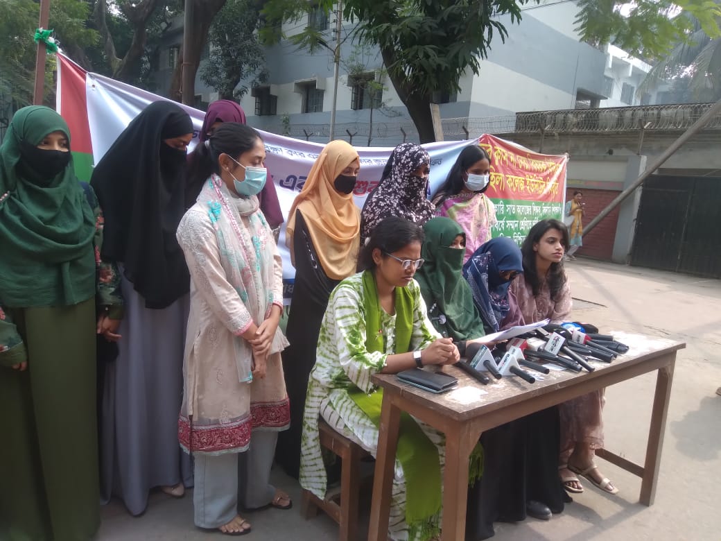 মোসাঃতানজিলা, ঢাকাঃ  মঙ্গলবার রাজধানীর স্বনামধন্য ইডেন মহিলা কলেজ শিক্ষার্থীরা প্রস্তাবিত ঢাকা কেন্দ্রীয় বিশ্ববিদ্যালয়ের ২০২৪-২৫ সেশনের ক্লাস শুরু এবং ৫ দফা দাবি নিয়ে প্রেস ব্রিফিং করছেন।