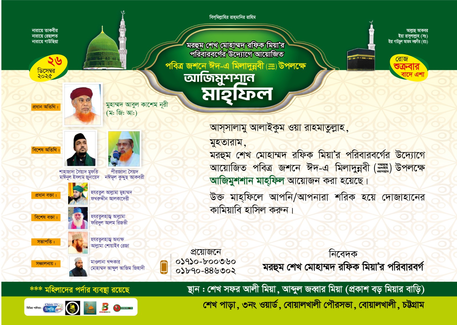 আগামী ২৬ ডিসেম্বর ২০২৫ ইং, রোজ শুক্রবার বোয়ালখালী পৌরসভার শেখ পাড়ার ৩নং ওয়ার্ডস্থ মরহুম শেখ রফিক মিয়ার পরিবারের উদ্যোগে পবিত্র আজিমুশশান মিলাদুন্নবী (স) অনুষ্ঠিত হবে।