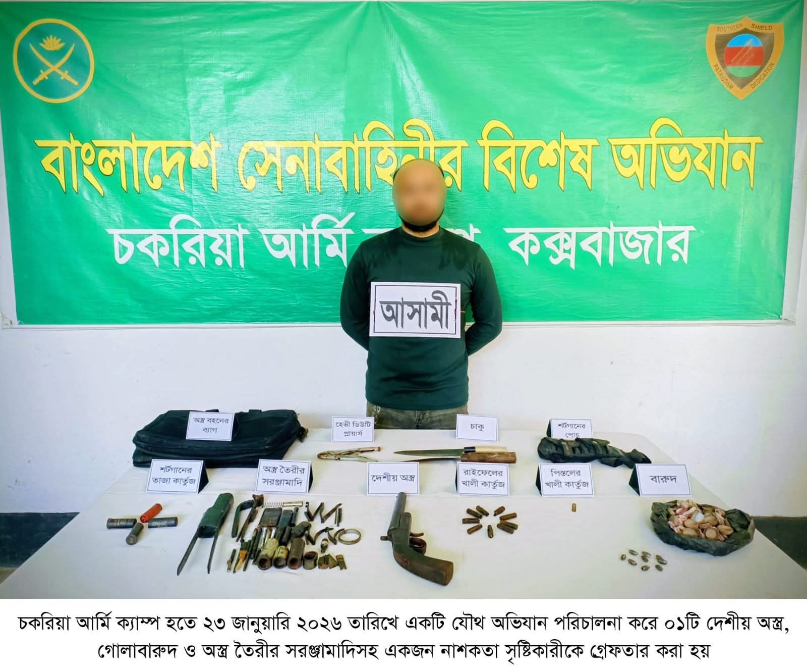 ২৩ জানুয়ারি ২০২৬ তারিখ গোপন গোয়েন্দা তথ্যের ভিত্তিতে কক্সবাজারের চকরিয়া উপজেলার ডুলাহাজরা ইউনিয়নের উলুবোনিয়া এলাকায় সেনাবাহিনীর একটি বিশেষ আভিযানিক দল ও পুলিশের সমন্বয়ে যৌথ অভিযান পরিচালনা করা হয়। অভিযানে অবৈধ অস্ত্র বহন ও তৈরির সঙ্গে জড়িত চিহ্নিত শীর্ষ সন্ত্রাসী আশরাফুল হোসেন সজীবকে আটক করা হয়।