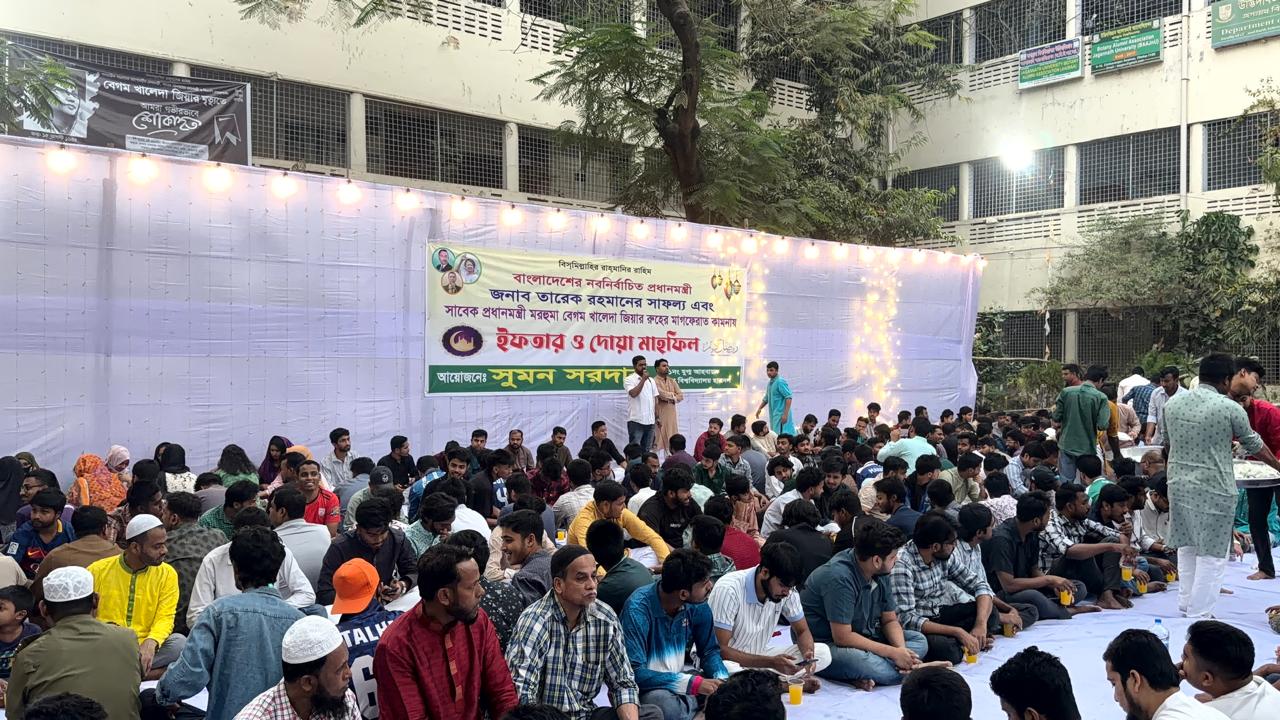 নবনির্বাচিত প্রধানমন্ত্রী তারেক রহমানের সাফল্য কামনা এবং সাবেক প্রধানমন্ত্রী বেগম খালেদা জিয়ার রুহের মাগফিরাত কামনায় ইফতার ও দোয়া মাহফিলের আয়োজন করেছে জগন্নাথ বিশ্ববিদ্যালয় (জবি) শাখা ছাত্রদল।