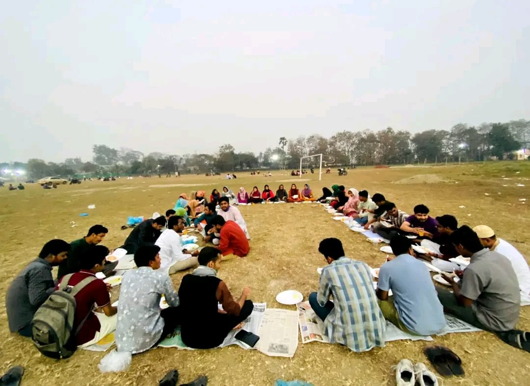 মাঠের সবুজ ঘাসের ওপর পাটি বা খবরের কাগজ কেউবা হল থেকে নিয়ে আসা চাদর বিছিয়ে বসে পড়েন শিক্ষার্থীরা। কেউ বন্ধুদের সঙ্গে, কেউ সিনিয়র-জুনিয়রদের নিয়ে, আবার কেউ নতুন পরিচিতদের সঙ্গে ভাগাভাগি করে নেন ইফতার। এখানে ধনী-গরিব, সিনিয়র-জুনিয়র বা বিভাগীয় ভিন্নতার কোনো বিভাজন থাকে না। সবাই একসঙ্গে বসে ইফতার করেন, যা ক্যাম্পাসে সম্প্রীতির এক অনন্য দৃষ্টান্ত হয়ে ওঠে।