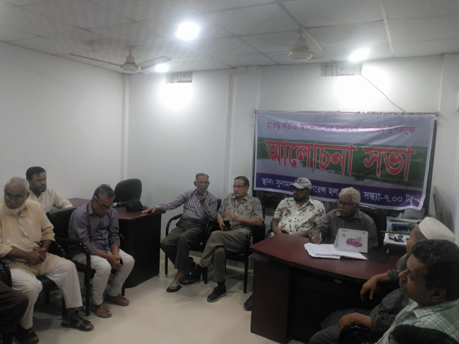 কেন্দ্রীয় কমিটির সহ-সভাপতি সুখেন্দু সেন এর সভাপতিত্বে এবং জেলা কমিটির ভারপ্রাপ্ত সাধারণ সম্পাদক সুরঞ্জিত গুপ্ত রঞ্জু এর সঞ্চালনায় আলোচনায় অংশ নেন হাওর বাঁচাও আন্দোলন কেন্দ্রীয় কমিটির সাধারণ সম্পাদক,দৈনিক সুনামকন্ঠ সম্পাদক বিজন সেন রায়, সুনামগঞ্জ জেলা কমিটির সভাপতি ইয়াকুব বখত বাহলুল, মুরশেদ আলম,আনোয়ারুল হক,মোঃ শওকত আলী, সাংবাদিক শামস শামীম ও সাংগঠনিক সম্পাদক মোঃ নজরুল ইসলাম।