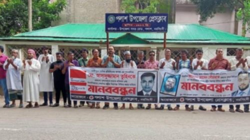 গাজীপুরে সাংবাদিক হত্যার প্রতিবাদে পলাশে মানববন্ধন