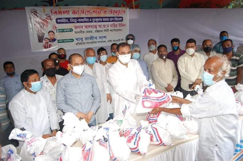 বিমলা ফাউন্ডেশনের উদ্যোগে পাঁচশত পরিবারকে উপহার সামগ্রী তুলে দিচ্ছেন সিটি মেয়র।